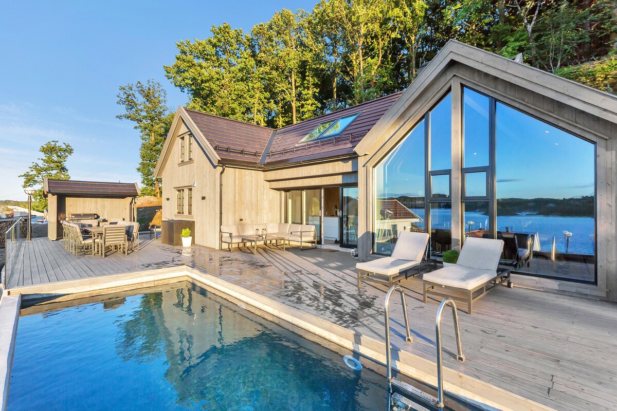 fantastic location, high standard incl. swimming pool. Here you can enjoy the sandy beach with children, fishing in the lake from land and boat. The cabin has a consistently high standard and is undisturbed, with great views. Create lifelong memories in this unique and family-friendly place. The place is located on an islet. Boat and washing are not included in the rental price, NOK 720 for boat per day. This is settled via Airbnb before arrival. The cabin is rented from Sunday at 4 pm to the following Sunday at 11 am