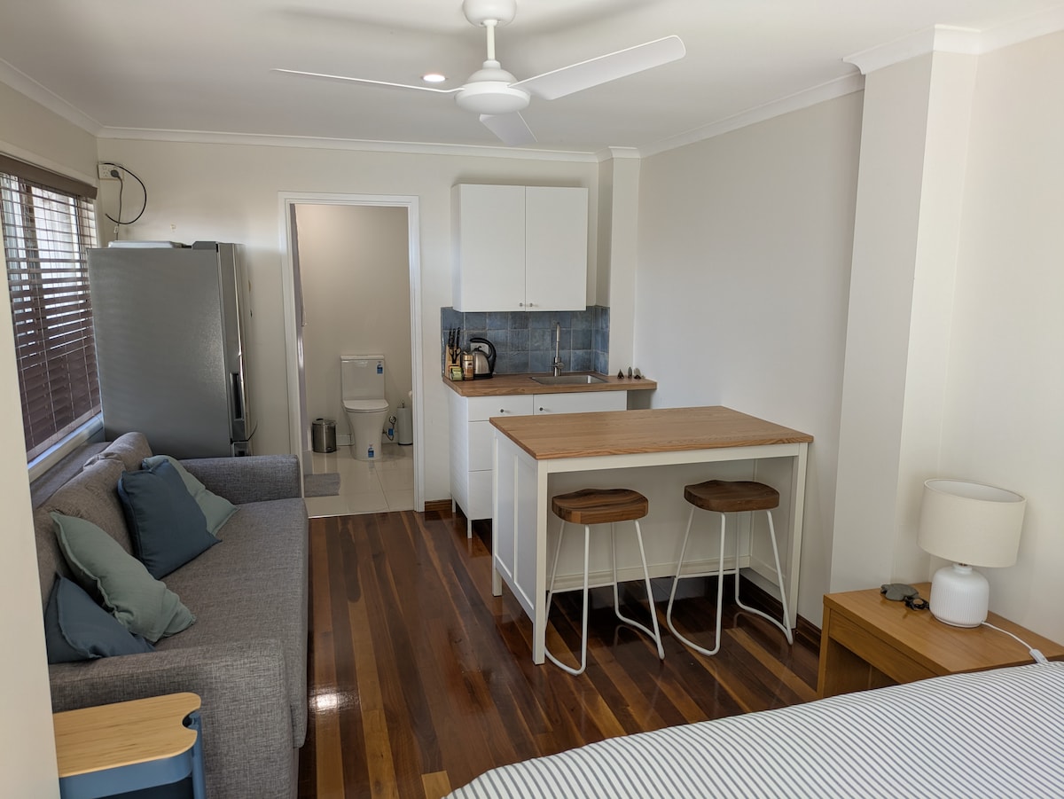 Our conveniently located studio apartment is just 10 minutes from the beautiful Maroochydore and Mooloolaba beaches. Enjoy a well-appointed private and cozy air-conditioned space including a 55" smart TV with Netfix, gigabit internet, and a work desk. Your own bathroom, kitchenette and private patio with BBQ. Washing machine, ironing board, and secure parking, suitable for Caravans and Motor Homes. Our Sunny Studio is the perfect base to explore surrounding beaches, local dining and shopping.