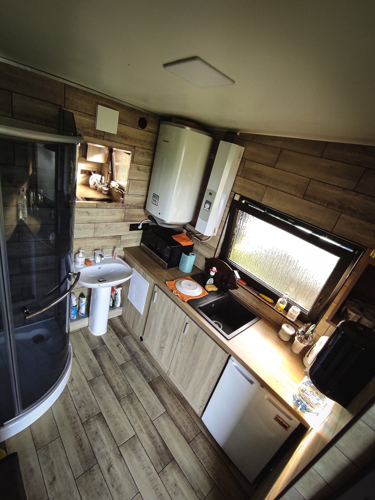 Outside you will have a big glass teracce and hot tub with a view of the pond. Just a few steps from your cabin there is an authentic,traditional sauna.