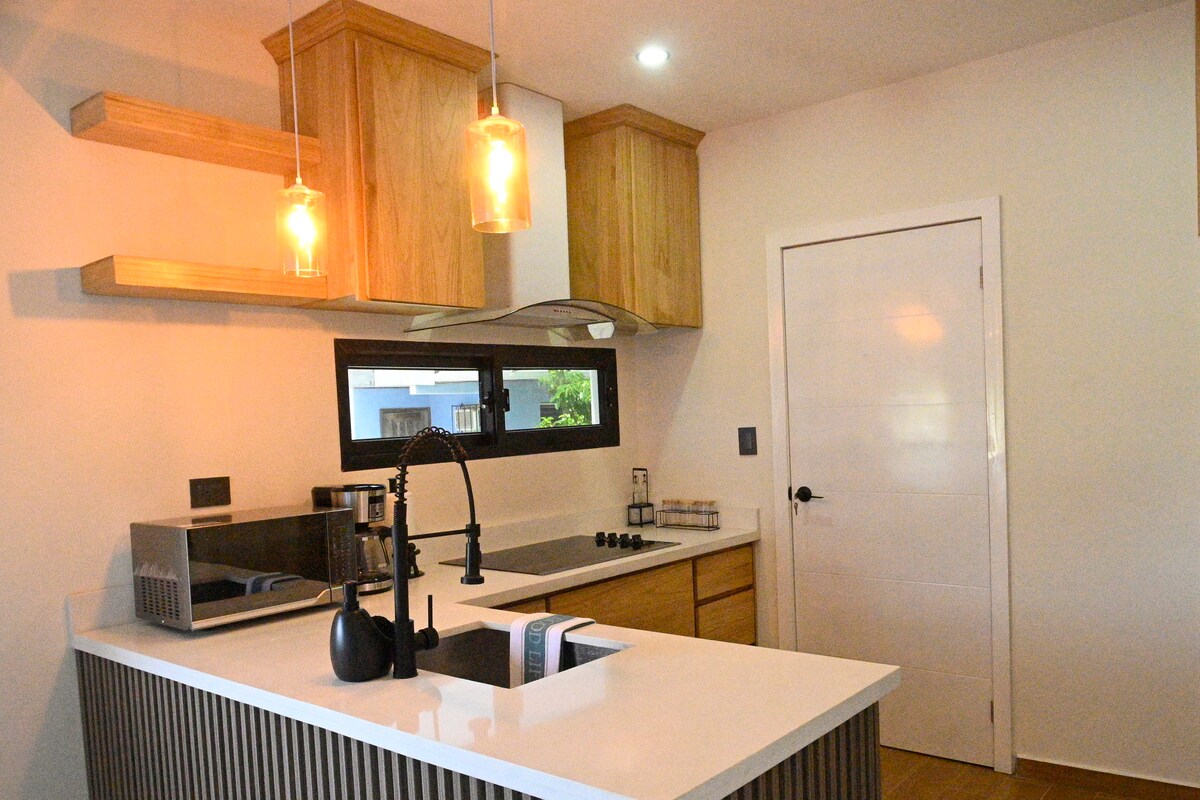 Charming new apartment with a cozy one-piece furnished stay perfect to enjoy with your companion, with equipped kitchen (refrigerator, microwave, electric stove, toaster, electric kettle), bathroom, air conditioning, and a workplace, plus a patio with beautiful view of a ceiba tree. Excellent location, with paved access: Downtown - 8 min Cabotage Pier - 10 minutes Golosón International Airport - 20 to 25 minutes Nearest pharmacy - 3 minutes