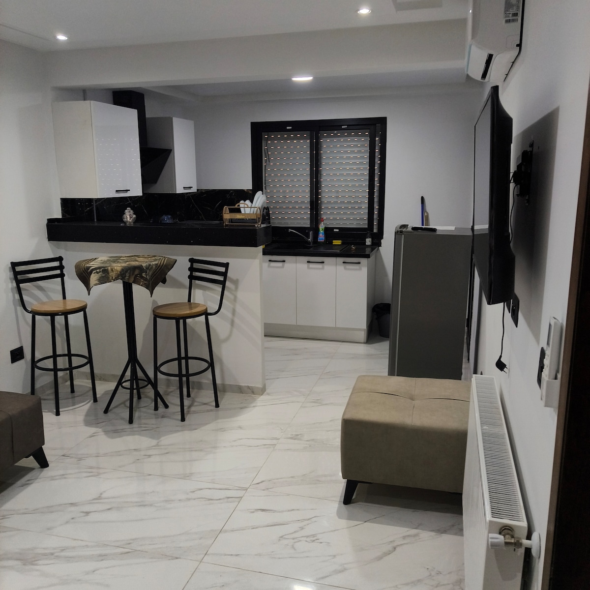 Beautiful S+1 apartment on the first floor, independent. Recently renovated, ideal location in Sidi Bousaid. The apartment consists of a bedroom with a bed (for 1 or 2 people), a walk-in shower, modern kitchen open to a beautiful living room with a traditional touch. Our accommodation is bright and equipped with everything necessary for your comfort: Air conditioning, Heating, Wifi, TV, cable"