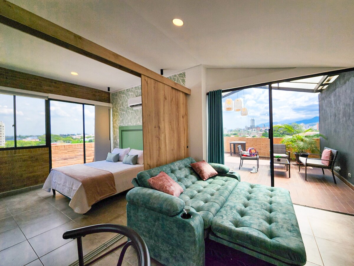 A building with a modern design to enjoy the best views of Cali, it has a strategic location in the north of the city: it will be very easy to plan your visit! Close to the airport, shopping malls, and a foodie area. Apartment with a large private balcony with a hammock and sofa, queen bed, desk, fully equipped kitchen, washing machine, and bathroom. A terrace with a 360 view of the city of Cali will allow you to enjoy the breeze and Cali sunsets. It has an outdoor shower and BBQ.