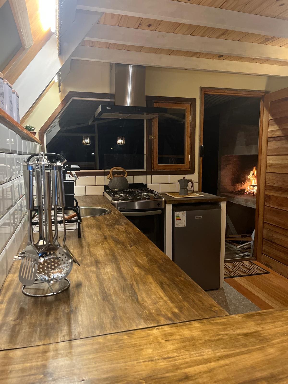 There is one bedroom with a queen-size bed on the ground floor, next to the bathroom. A spiral staircase leads up to the upper floor, where you will find the kitchen and living room integrated into a warm, comfortable, and modern space, with large windows that give the feeling of being outdoors. The economical wood-burning stove adds the perfect finishing touch for those chilly nights. No Parties or Pets.