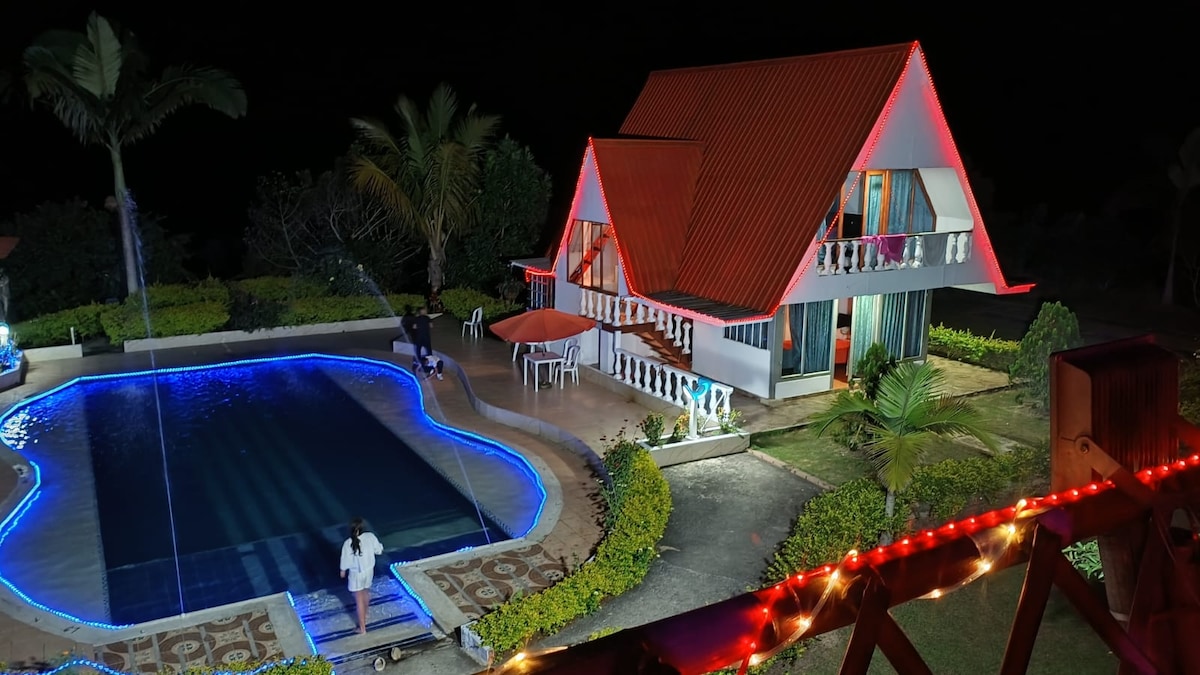 One-hectare estate with a small but comfortable rustic chalet with 6 bedrooms and 3 bathrooms for 12 people, overlooking the mountain, 15 minutes from the Tobia River (kayaking, rafting, zip-lining, hiking). 10 minutes from Villeta and close to the highway. Gardens, fruit trees, hammocks, small pool and green areas. Parking for 5 vehicles. Fenced, safe and private. Ideal for families, adventurous groups, and church retreats. The roads are unpaved, we recommend high clearance cars.