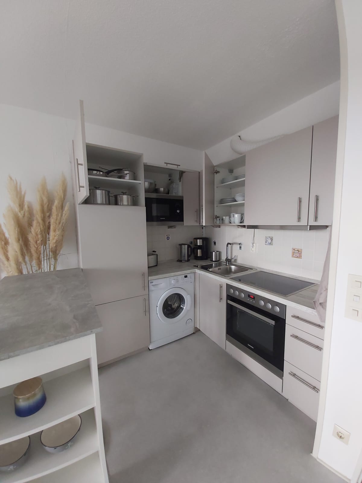Modernized open and airy apartment with stunning views over Kiel Bay, located right by the Kiel Schilksee Marina. The "bedroom" is a half-height lounging area (no standing height), which can be reached via a small wooden ladder/staircase. Also from the bed you have a great view of the water. There is also a TV corner. 1 car parking space in a parking lot secured with a barrier is at your disposal.