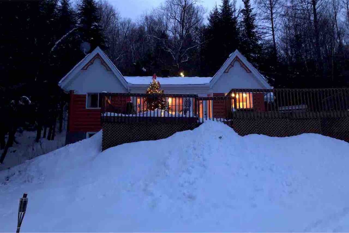 Charming little Swiss chalet overlooking a clear and natural lake (no motorboats). The rustic chalet is very warm and cozy. You can enjoy the wood and forest's scent and listen to the loons while sitting right above the magnificent pristine lake ! The huge private dock is just for you. Everything is there: fireplace, BBQ, satellite TV, unlimited WiFi, 2 kayaks, 2 canoes, trouts if you fish. 5 minutes from l'Estérel. CITQ number: 296337