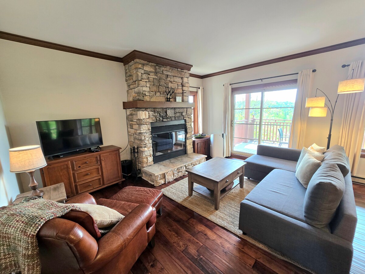 Beautiful condo 2 bedrooms King and Queen beds + 2 bathrooms + sofa bed, very well equipped kitchen, gas fireplace ... up to 6 people. Washer / dryer, shared BBQ. Perfect for golf, fishing, biking, cross-country skiing and + Opposite the Le P'tit Train du Nord cycle path ... 234 km Children's park and 1.3 km from the village of Saint-Jovite. FREE public transportation at 1 minute from the condo. Unlimited high-speed WiFi. Animals not accepted. No smoking. CITQ: 303554