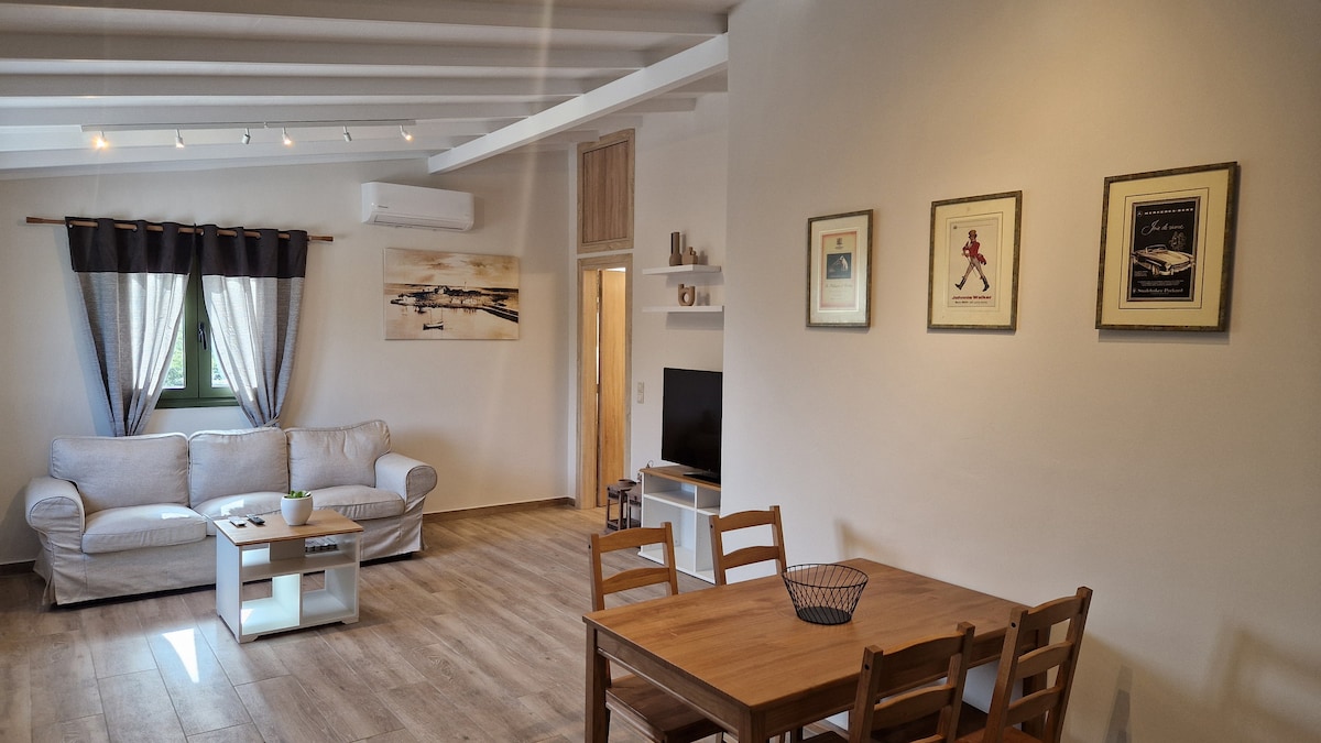 In nature and 300 meters from the sea, in 1000 sq.m. with stone-built fence and natural shade from trees, renovated house of 70 sq.m. with two spacious bedrooms, large bathroom, washing machine, kitchen and fully air-conditioned spaces, with available space for parking and children's activities.