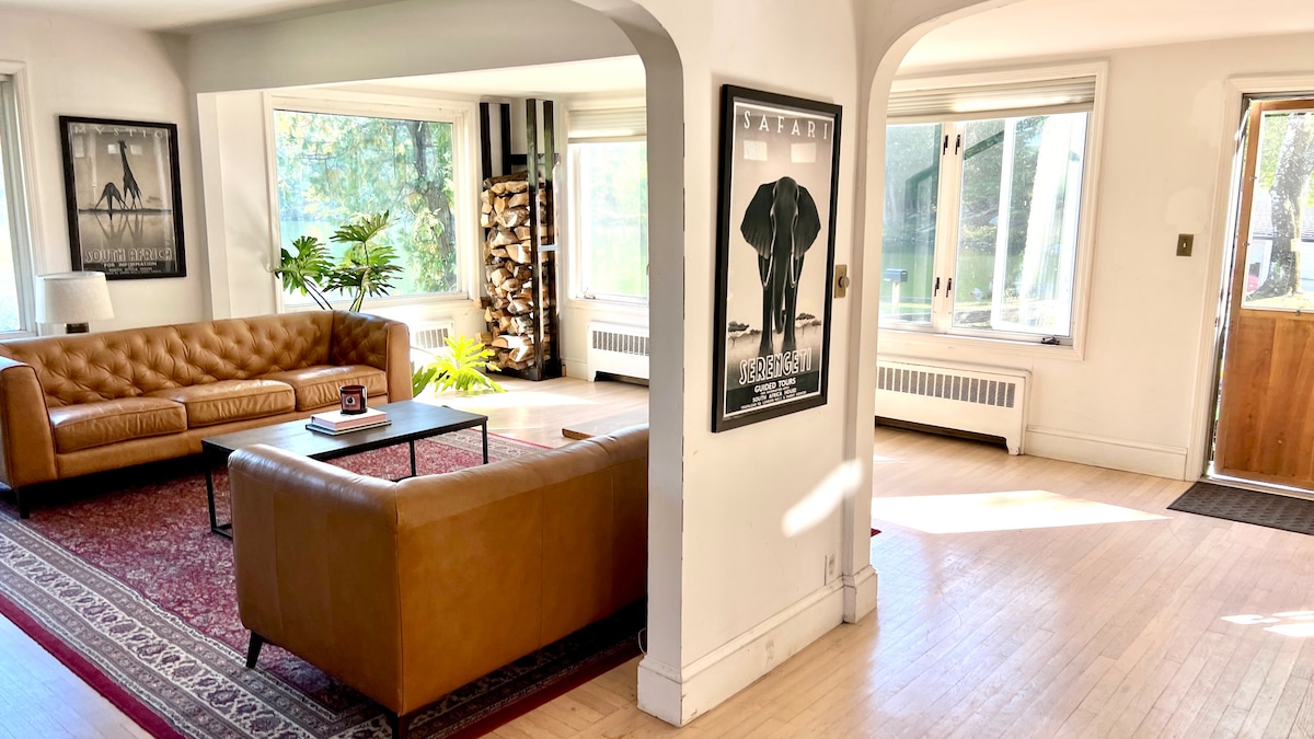Ultra Chic Cottage set high above Greenwood Lake with Private beach and lake front community access. Minutes away from Mountain Creek Ski Resort, Spa & Water park, Mt. Peter Ski & Tubing, Warwick creameries, breweries & vineyards & apple picking. 1 BR, 1 Bath, play/office/common room. Huge wrap around fenced in deck with Mid century modern fireplace allows for scenic dining, lounging and around the fire gatherings. #LakeViewCottage_GWL Town of Warwick Short Term Rental Permit #P25-0245