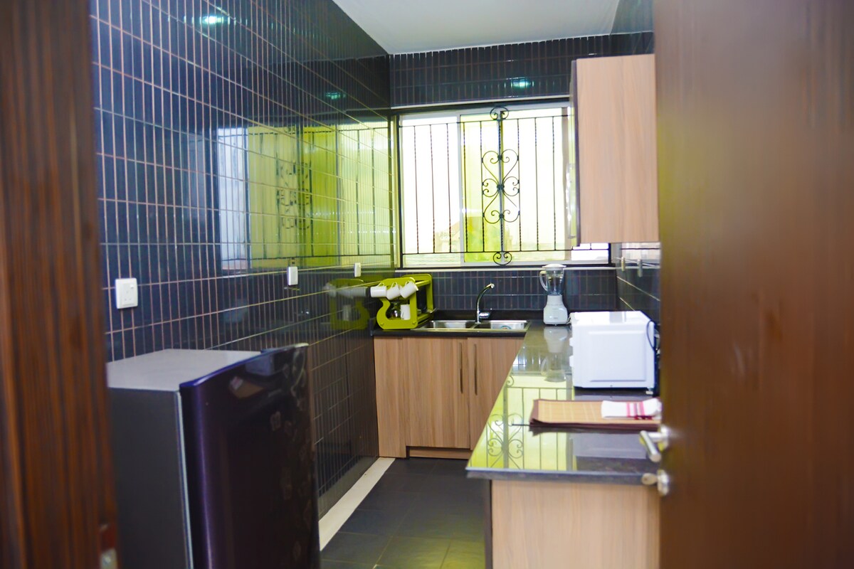 You’ll love the stylish decor of this charming place to stay. It’s a one bedroom apartment with a shared sitting room, dinning, kitchen and a private toilet. Ac also available, microwave, running water, washing machine, and chilling fridge. Also Netflix, Dstv and YouTube on the go. Also there is a provision for meals on request ranging from stew, soup and others. Also light all through the night till dawn at least 10-15+ hours light daily.