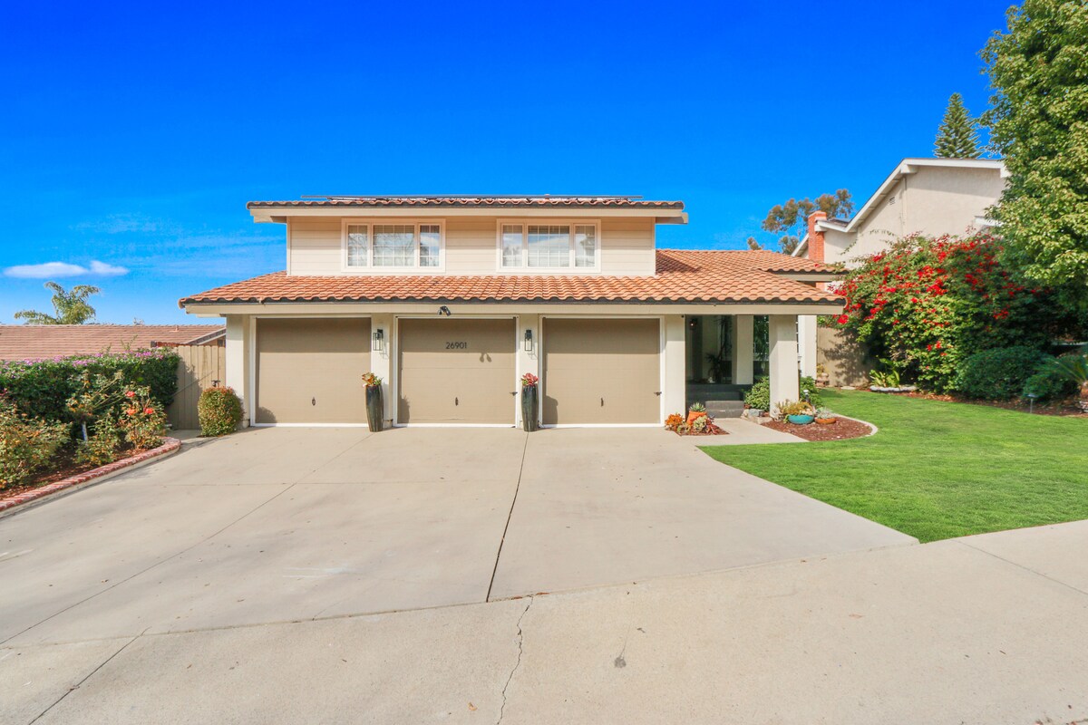 Our spacious family home has been recently remodeled and includes a large yard, spa, outdoor entertaining space, gourmet kitchen, views galore AND super comfortable beds! It is ideally located only 2 minutes from major freeway and is central to every SoCal attraction: beaches -- 10 minutes; Disney -- 30 minutes; SD Zoo & Legoland 45 minutes. Close to high-end shopping & restaurants. This is the perfect hub for you and your family.