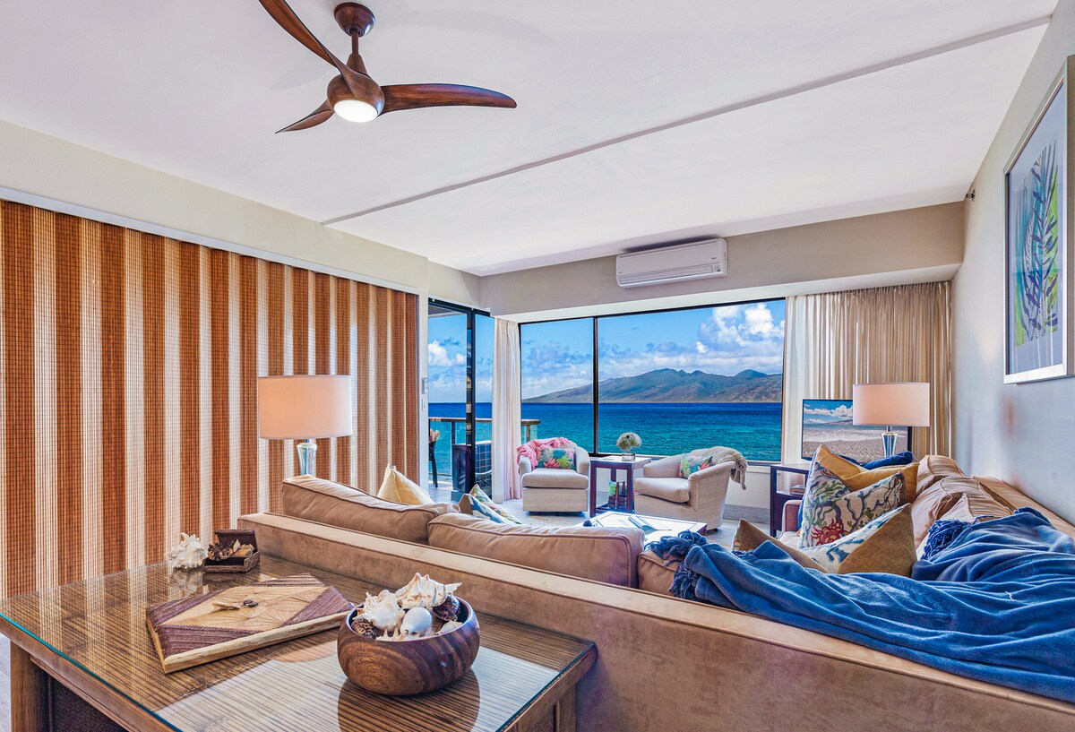 Locally Owned and Operated Studio condo with the best direct beachfront location, panoramic Ocean views, sunsets, and seasonal whale watching. The owner’s spared no expense in renovating this unit making it hand’s down one of the nicest units in all of the Mahana. Wake up to the cool tropical breeze and sounds of the shoreline just 50 feet away. Located on North Kaanapali Beach. Enjoy stunning views and the warm Maui sun inside while central AC keeps you cool and comfortable any time of day.