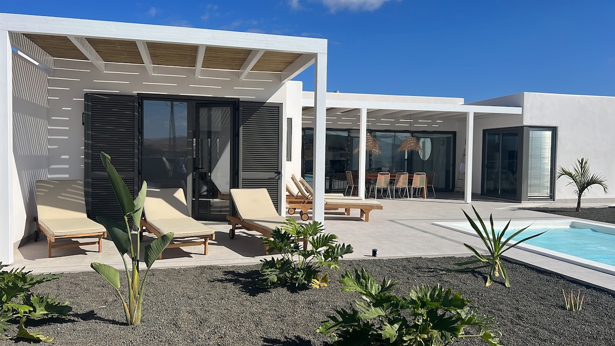 Completed in 2023, this modern 340 m2 villa with heated pool and 5 bedrooms is perfect for families or groups of friends or colleagues who want to spend a relaxing holiday in the beautiful village of Lajares. It is centrally located. The supermarket, various bars, restaurants and shops are within easy walking distance. The plot of 3.200 m2 offers tranquillity and privacy.