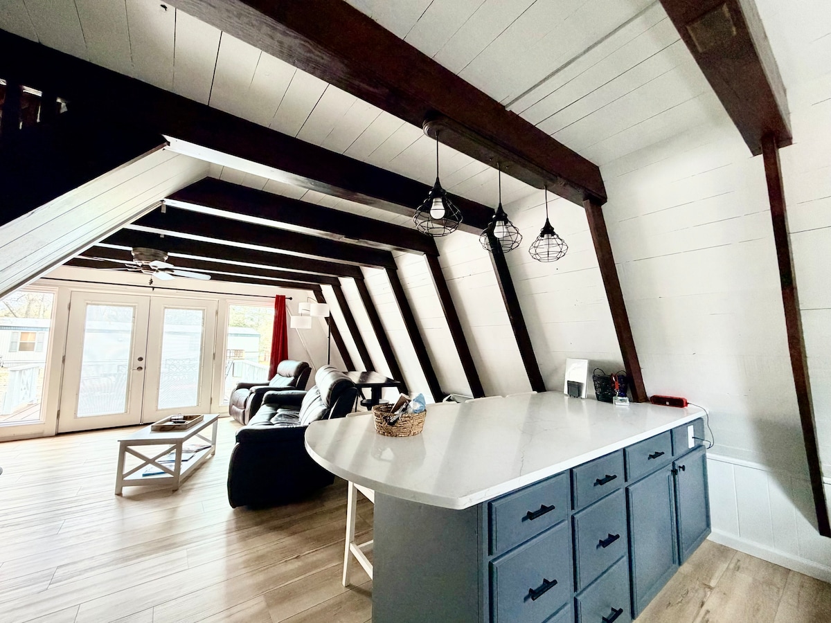 Float On Inn is a charming, pet-friendly A-frame just 150 yards from Kentucky Lake. Relax on the screened patio, toast marshmallows by the firepit, or cast a line from the shore. With cozy beds, fast Wi-Fi, and a rustic-modern vibe, it’s ideal for families, friends, and four-legged companions. Whether you’re catching bass or simply soaking up lakeside calm, Float On Inn is the perfect getaway.