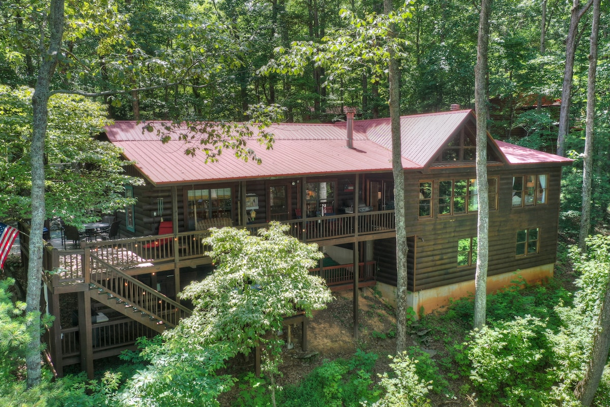 Gorgeous open concept cabin with living space all on a single story and mountain views! 20 min from downtown Blue Ridge. Perfect for a family trip, romantic getaway, fun weekend with friends or a working vacation(100 Mbs WIFI). Enjoy your morning coffee or a hot tub soak on the 2-story deck overlooking the trees & beautiful mountain view. Go hiking on the well-kept Benton Mackaye trail, which goes right by the cabin. Trout fishing, kayaking, Toccoa river, and Lake Blue Ridge within minutes!
