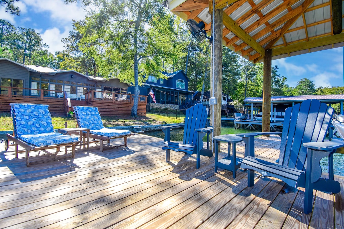 Lakefront Oasis with Dock, Outdoor Lounging, and Modern Workspaces Escape to this brand-new lakefront retreat on Lake Martin! Enjoy a private boat dock with Adirondack chairs, outdoor seating for dining and lounging, and two workstations perfect for remote work. The spacious open-concept living area blends rustic charm with modern luxury, offering a fully-equipped kitchen and comfortable spaces for relaxation. Luxury tritoon boat with captain available to hire for an additional fee.