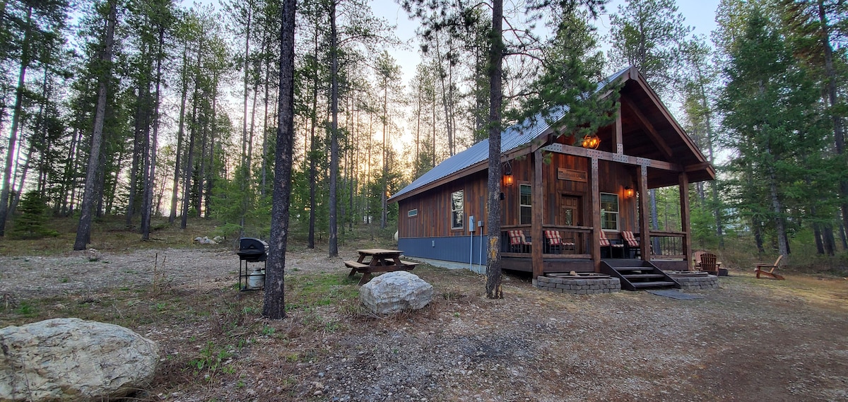Enjoy the peace and quiet of a private, wooded retreat! Spruce Pine cabin is tucked away at the base of the Swan Mountain range and surrounded by towering pines on a property teeming with deer and wild turkeys. Located a mere 14 miles from the west entrance of Glacier National Park, you can spend your days adventuring and your nights enjoying the luxurious simplicity of a movie in front of the fire, dinner on the patio and stargazing at the clear night sky.