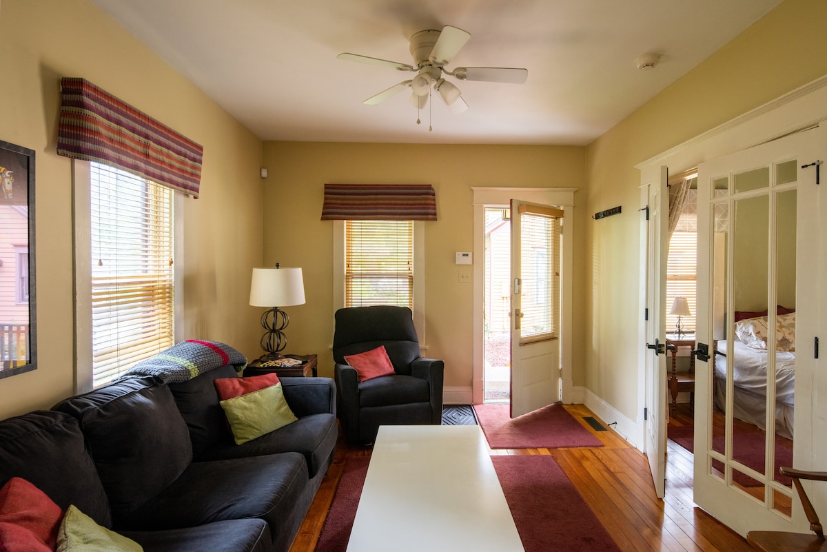 This guesthouse is detached from the main house, comes with garage parking and has all the amenities you need including a wood-burning fire place! Towels, bath tissue, soaps & travel items. AC Window Unit. Kitchen includes pots/pans, dishes, mugs/glasses, coffee pot, toaster & microwave. Paper goods. New appliances/new water heater in 2020. Stairs to the apartment are on the northeast corner of the garage. The beach is steps away with a fire pit, boat house lounge, kayaks, beach toys & bicycles.