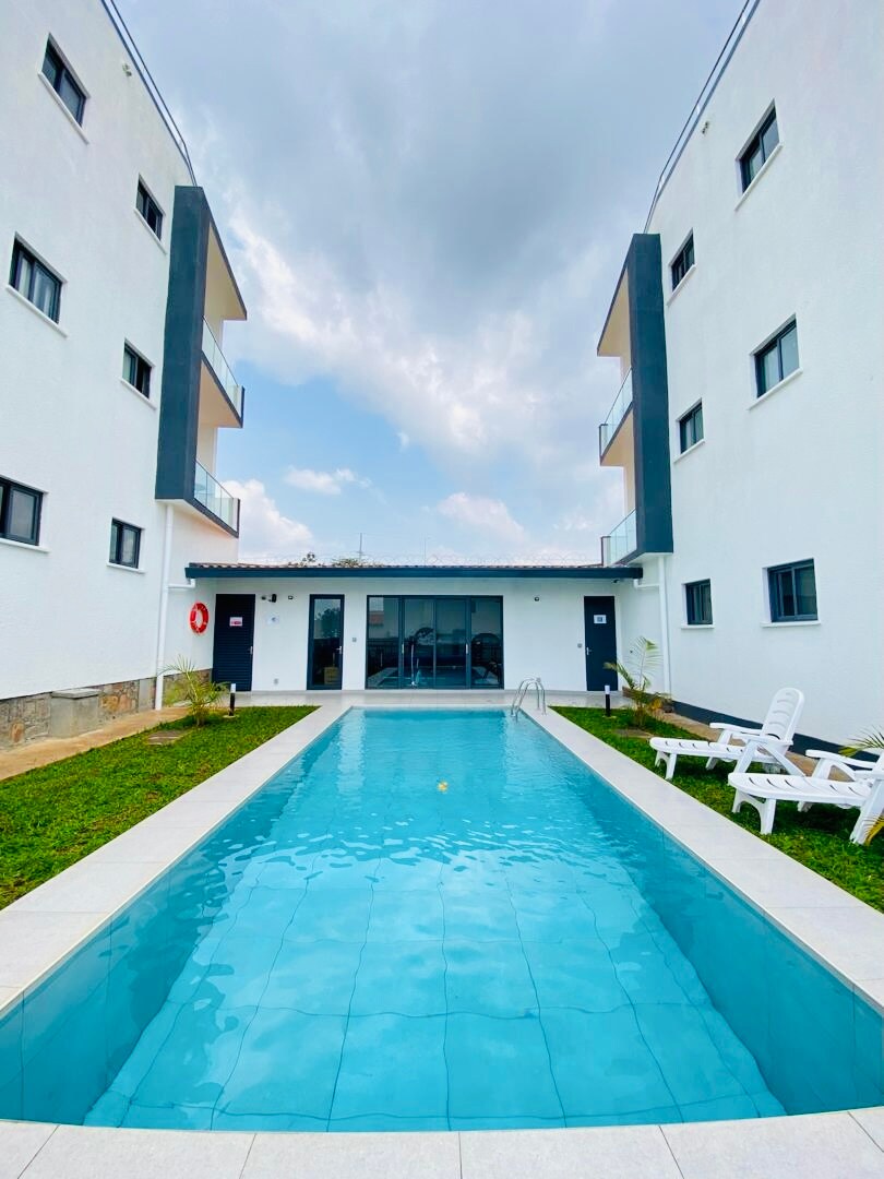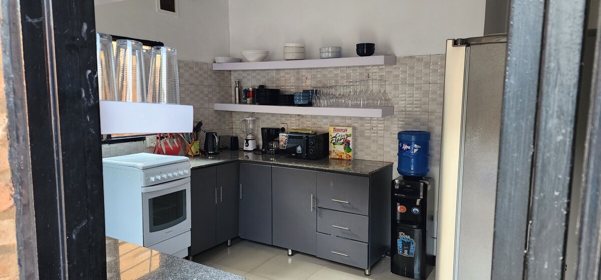 This is a comfortable modern house that is fully furnished, with an open plan living area and a well-equipped kitchen. It also offers two king-sized bedrooms and a futon with a private terrace and views of Kigali. It features a swimming pool and a modern gym. Utilities include fiber optic WIFI, TV, a laundry machine (washer and dryer), 24/7 security, and a private garage. No pets or smoking. Long-term stays are available and can be discussed.
