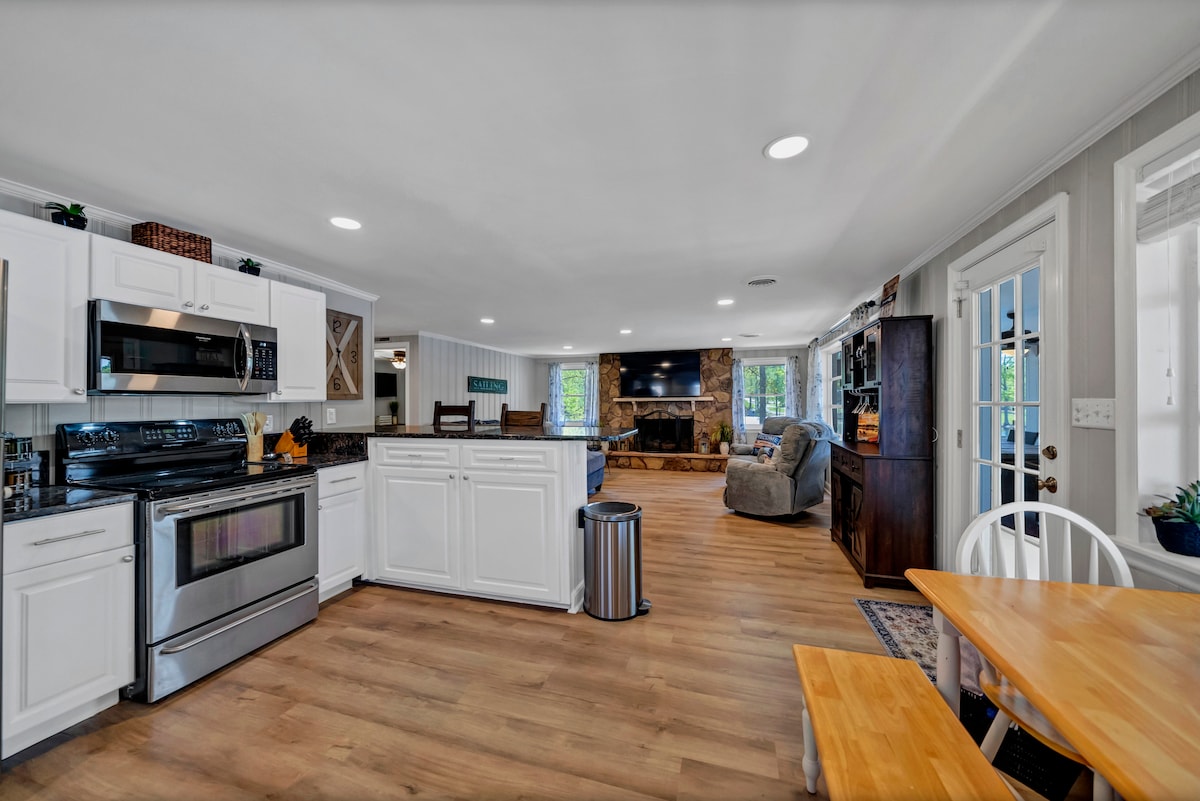 "SERENITY NOW" -Sunset views / Point lot / Deep water / Mid-lake / Peaceful cove / Close to marinas & big water / Private beach / Private dock & boat ramp / Fire pit / Multi-generational & pet friendly / High speed internet / Spacious screen porch with TV & dining for 8 / Lots of parking / Loft / On site laundry / Great kids' bedroom / Indoor & outdoor games / fully remodeled with lake vibe. High end features like stone fireplace, bidet toilet seat, Bosch Dishwasher and Grohe faucets