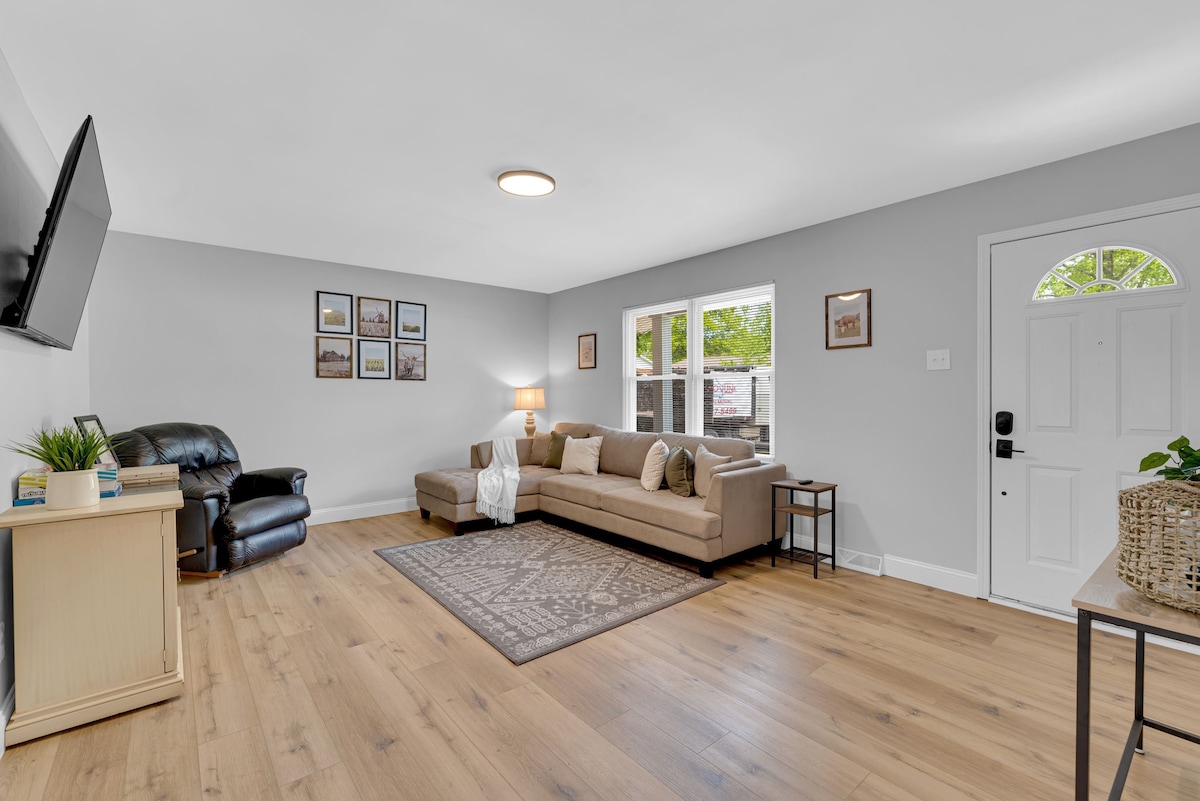 Cozy 2BR O’Fallon home sleeps 6 adults plus children with 2 queen beds, pull-out sofa, floor mattress (great for kiddos!) & pack n play available upon request. Pet-friendly with large yard! Fast WiFi, fully stocked kitchen, flatscreens in every room. Super clean, quiet street, easy Highway 70 access and only 23 min to Lambert Airport. Perfect for families, business travelers, relocations & traveling nurses. Seamless check-in and affordable rates. Everything you need for a comfortable stay!