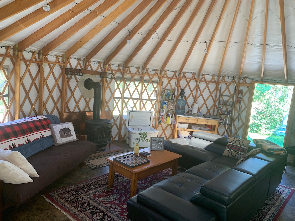 At 7,000ft elevation, the 24ft Pacific Yurt is in an aspen grove with Conrad Creek flowing year round, feet from the yurt. Fully furnished with 2 queen beds, 2 couches, pull out futon, and 2 cots for sleeping. The yurt has solar lights and power, a propane oven, propane fireplace, propane cook tops, full kitchen gear, bottled fresh water, separate bathroom structure. The yurt has vehicle access and is located on 120 acres private property minutes from other people. Very relaxing and peaceful.