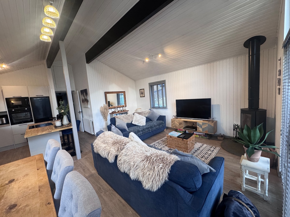 The Hide Lodge is a stylish space, designed with relaxing and retreating in mind. It is cosy and warm with underfloor heating. The open plan lounge and living area has full width bi-fold doors, which allows the space to be fully opened up to feel like part of the woodland beyond. The main bedroom boasts sliding french doors, also overlooking the woodland and stream, with a bath placed to enjoy this view. There is a private terrace and patio area to enjoy al-fresco dining or star-gazing.