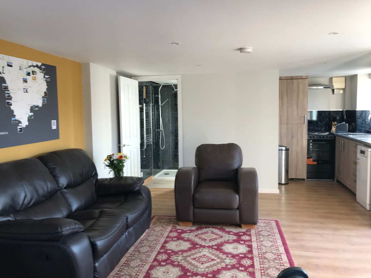 Comfortable, spacious top floor, seperate apartment, of our home. Comprises of one bedroom, one bathroom with kitchenette and spacious lounge. Own access via the top floor back door. Right on the beach with lovely sea and valley views. Use of the shared garden and pet friendly. Super fast wifi. Quiet costal hamlet, 5 minutes from a village with local shops and good pubs. Great access to the south west coast path and glorious beaches and coves. An ideal get away for couples.