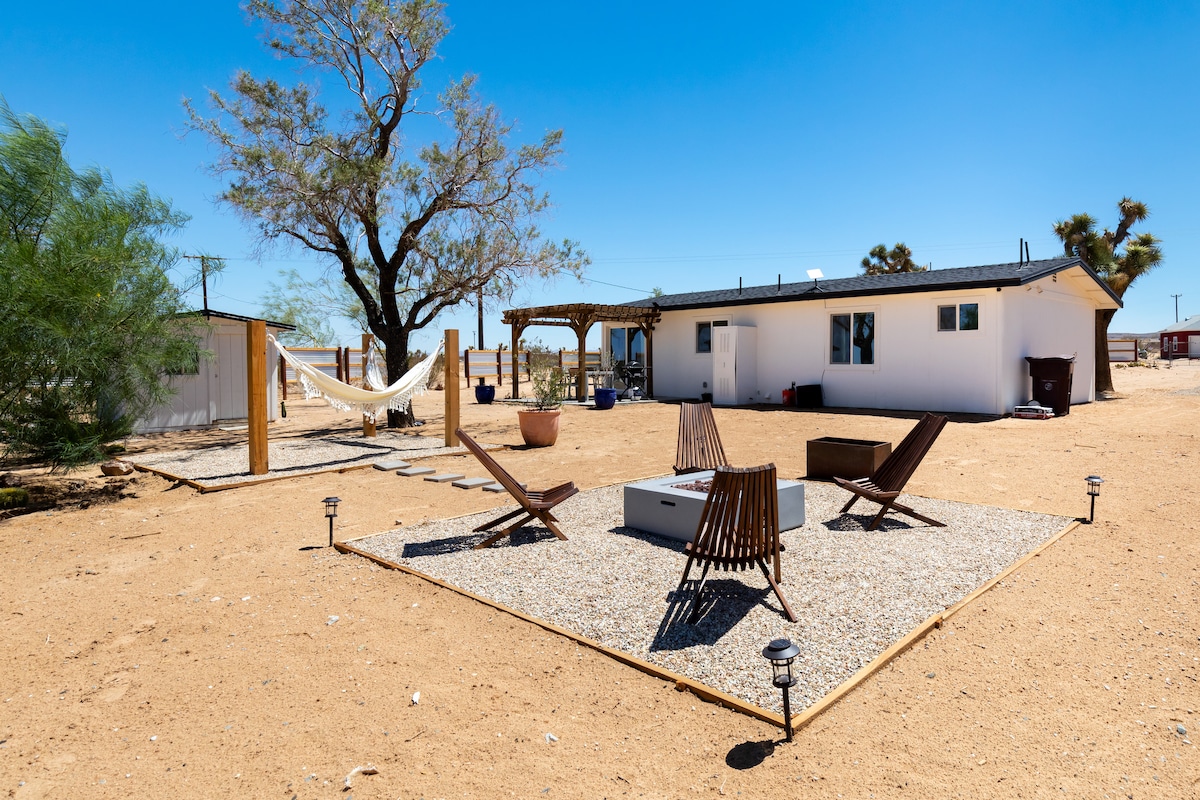 Welcome to Chappies Desert Escape, your ideal friends & family getaway! "The perfect blend of 'close enough' and 'just far enough away." ☆ 5 Acres of Private Desert ☆ Spacious Hot Tub w/ Lounge & Yoga Deck ☆ Cowboy Pool ☆ Mega Chess, Cornhole, Horseshoes ☆ Game Room, Claw Machine, Foosball Table ☆ Incredible Stargazing & Mountain Views ☆ Three 2-Person Cube Hammocks ☆ Gas & Wood Fire Pits ☆ Coffee Bar ☆ Propane BBQ ☆ Fully Equipped Kitchen ☆ Pet Friendly ☆ Baby/Infant Gear ☆ High-speed WiFi