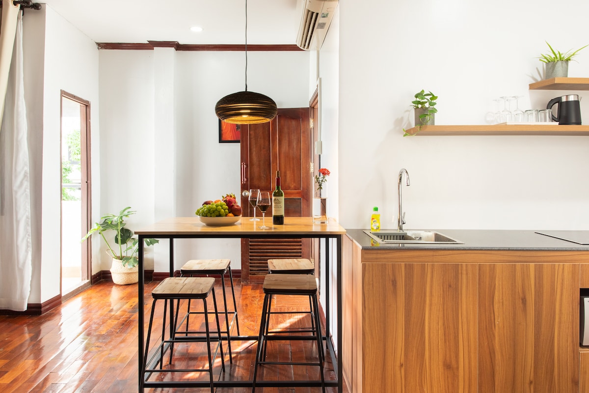 This amazing French colonial home on temple grounds is a heritage listed treasure & all yours to enjoy. Quiet & secluded with ample space yet the vibrant buzzing street life is just around the corner. A truly remarkable location beside the peaceful enchanting Wat Aphay. This upstairs classic abode for 4 people has two King sized bedrooms (4x4m) with a single bathroom. The main living area is homely with a comfortable lounge TV room & dining setting, Rosewood office desk & renewed kitchen.