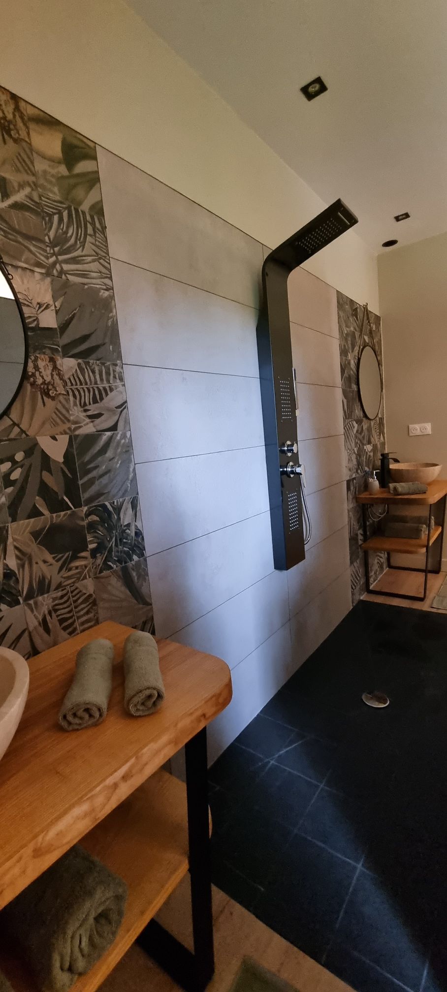 Le Nid du Merle is a little haven of peace. Quiet and elegant accommodation, large air-conditioned bedroom with a bathroom with bathtub and shower and an equipped kitchen. Chalet with its own two-seater jacuzzi + Finnish sauna for private use, with open area: garden furniture, terrace, bioclimatic pergola barbecue and plancha. Access to the swimming pool area heated to 30°C and a large outdoor jacuzzi. Boulodrome (petanque kit). Mini animal park, flower beds over 2 ha.