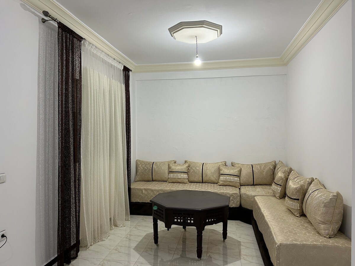 A spacious apartment with modern Moroccan décor, located in the heart of the city near shops, restaurants, and markets. It has two bedrooms, a bathroom, a toilet, a large living room, and a fully equipped kitchen, ideal for families or couples with a marriage certificate. It provides a quiet atmosphere and high-quality bedding to ensure comfort. House Rules: Rent for families or couples with a marriage certificate, - No evenings and parties - No noise after 10pm. - Respect the neighborhood and the internal rules of the residence. ‼️ According to Moroccan law, it is forbidden to rent the apartment to unmarried couples.