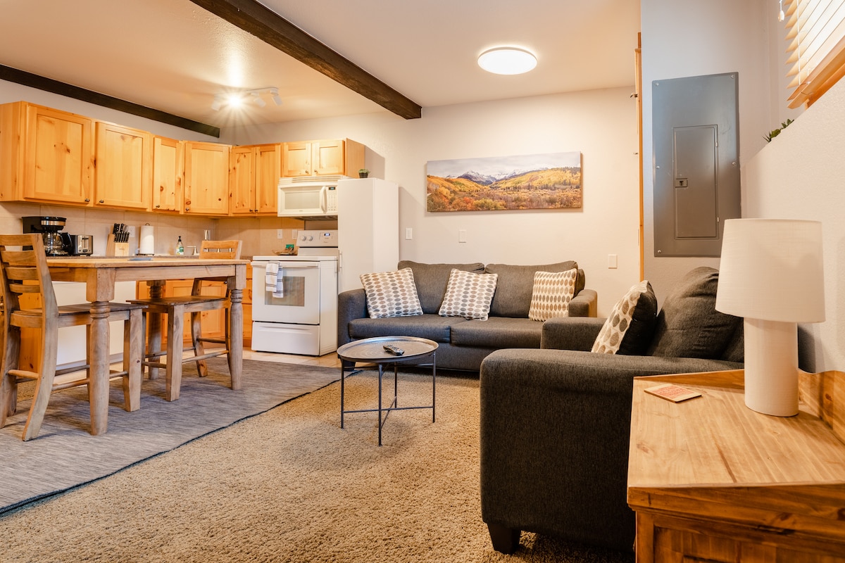 This charming and cozy river-adjacent condo set against a breathtaking rock-face backdrop in the heart of downtown offers easy walking access to shopping, restaurants, gorgeous views, and only a short drive to the park. It is not uncommon for our guests to awake to herds of elk mere feet from the front door! Check out our other similar listing right next-door, Unit #9 & 10! You may find other available dates or maybe even a more competitive price! airbnb.com/h/thelofts9 airbnb.com/h/thelofts10
