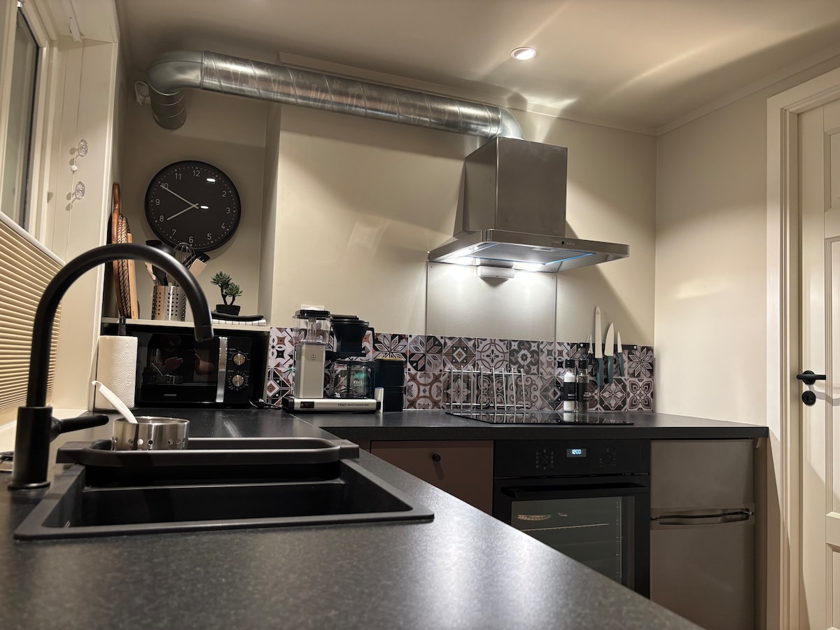 Enjoy the tranquility of Larvik in our recently renovated one bedroom apartment. Located on the bottom floor and just a 5-minute walk from the town center, next to the peaceful Bøkeskogen, our home offers both convenience and serenity. Savor the charming view of the sea in a quiet neighborhood, perfect for unwinding after a day of exploration in this quaint town. Ideal for those seeking comfort and easy access to local attractions.