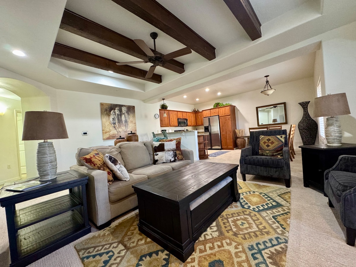 Southwestern style 2 bedroom condo in Villa Esperanza. Queen luxury bed in master bedroom, queen bed in second bedroom. Gated community minutes from historic Old Mesilla. Exercise room and swimming pool. We take care of our guests like they are family, with great warmth and friendship. Enjoy our southwest cozy abode elegantly decorated in modern southwest style and most comfortable beds and bedding. Your family will be close to everything when you stay at this centrally-located place.