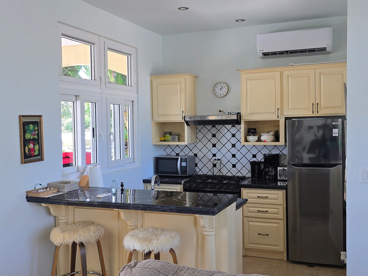 La Casita is a full indipendent guest house. Consist in one big ambient, with a full furnished kitchen, a living area with sofa-bed, a queen size bed, a walk in closet and a really unique bathroom with a huge shower. A large tropical garden surrounds the property, and the owner lives in the large house next door. Access to the beach is only 200 meters away.