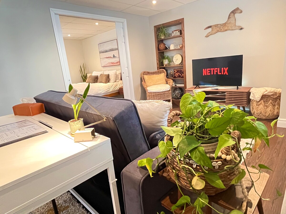 Well sized loft situated in the basement of a duplex type house, It’s perfect for families with their children . Netflix 4K subscription, Washer,dryer,dishwasher,unlimited internet 1.5g . single daybed , easily becomes king bed . Double bed.three places bunk bed.full size kitchen with dining table and 6 chairs ,parking for 2 cars. Grand loft situé au sous-sol d’une duplex détaché à saint janvier,parfait pour les petites familles avec les enfants, Cartier très calme et familiale, Citq:309085