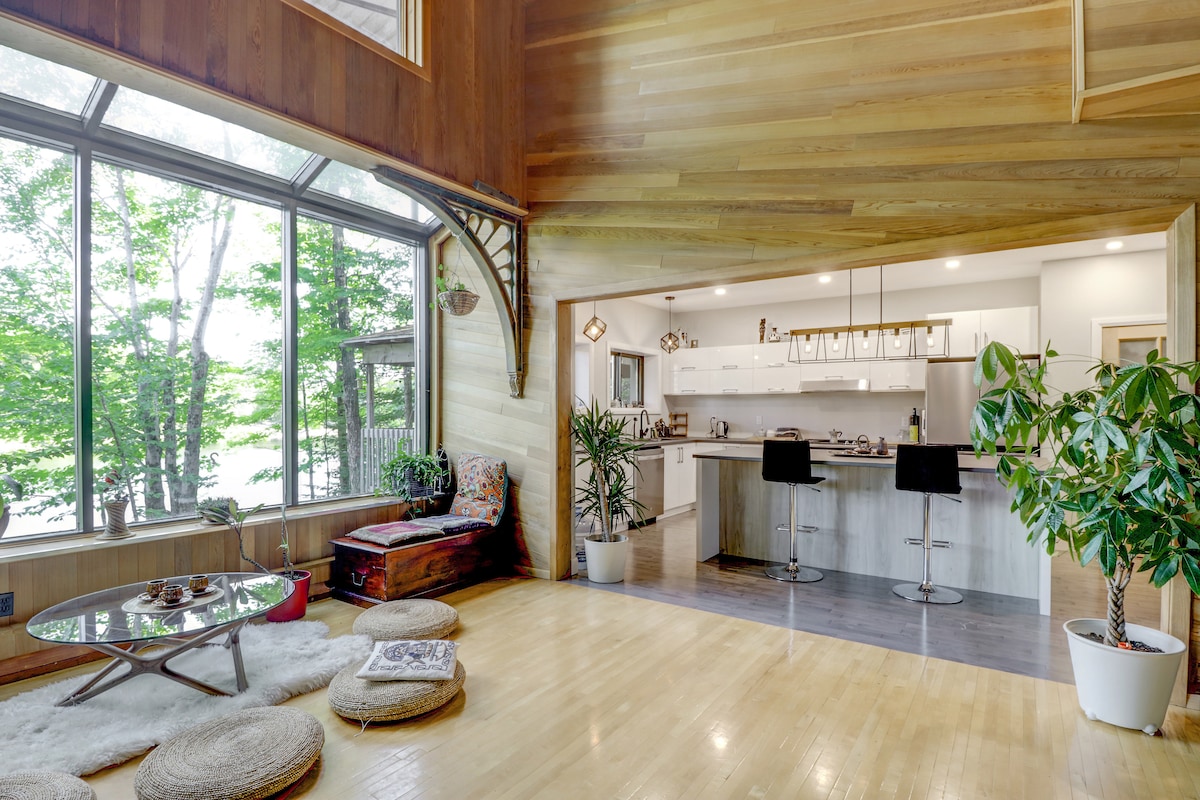 A fabulous space, 2600 square feet of shimmering wooden walls and ceiling. On a private lake 1 hour from Montreal. A perfect get away to inspire your Creativity and relaxation. With full length windows looking onto the lake, you can immerse yourself in nature while on a perfect wooden floor for yoga, meditation, dance, musical exploration, reading, writing and much more… Completely soundproofed with professIona acoustics, ideal to encounter the best creative energy to inspire and motivate.
