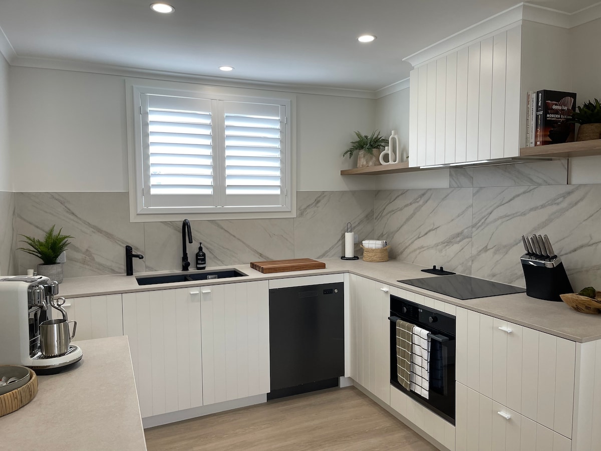 Stylish modern self-contained unit adjacent to the river, enjoy the water views from your private deck. Located just a short walk to cafes, restaurants, club and pub. 5 minute drive to beaches. Unit has free wifi, Netflix, dishwasher, under bench fridge and freezer, microwave, oven and cooktop. Tea, sugar and pod coffee system provided. Private bedroom with queen bed, bathroom separate toilet. Fans in every room with air-con throughout. Linen, hair-dryer, iron and ironing board provided.