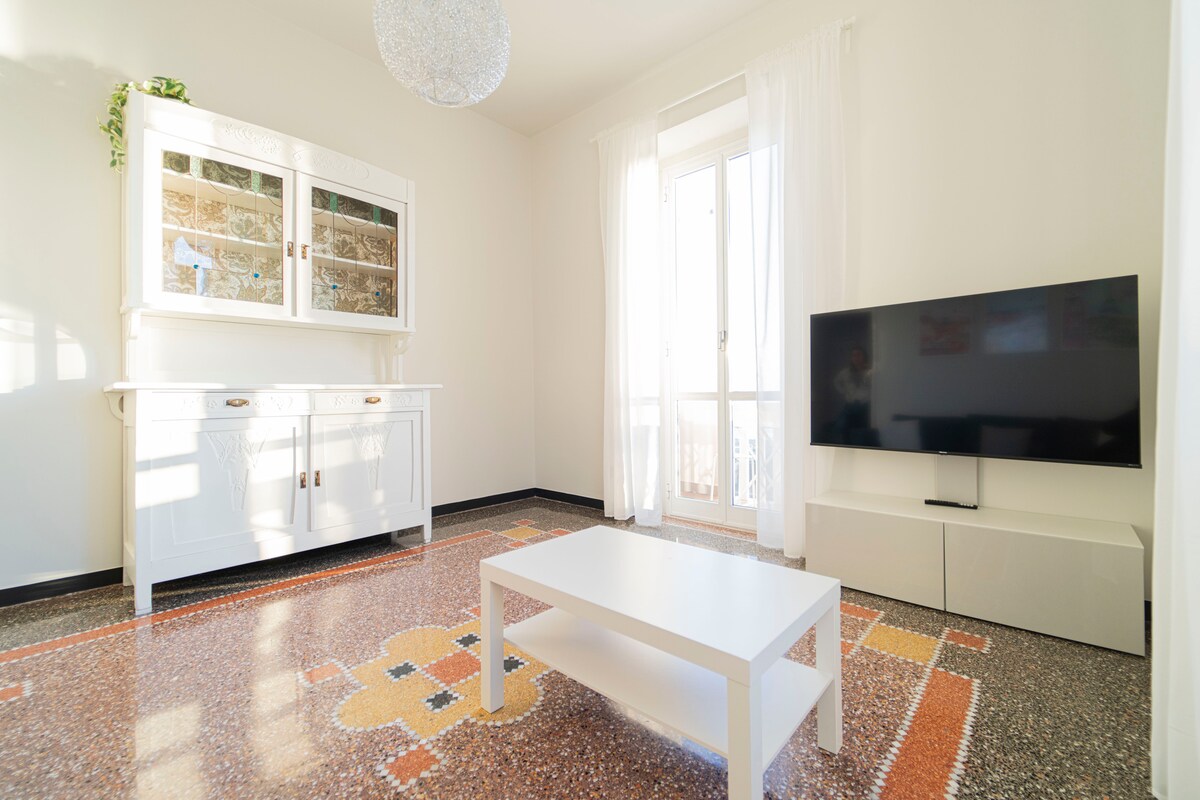 Bright apartment located on the 2nd floor of a historic building (with elevator) in the city center of Chiavari. A stone's throw from the sea and in a strategic position for reaching all the nearby tourist resorts. The apartment is very large, can accommodate up to 5 people and consists of two large living rooms, a spacious kitchen (dishwasher, fridge, oven) a double bedroom, a bedroom with 2 single beds and a bedroom with 1 single bed, a bathroom with washing machine.