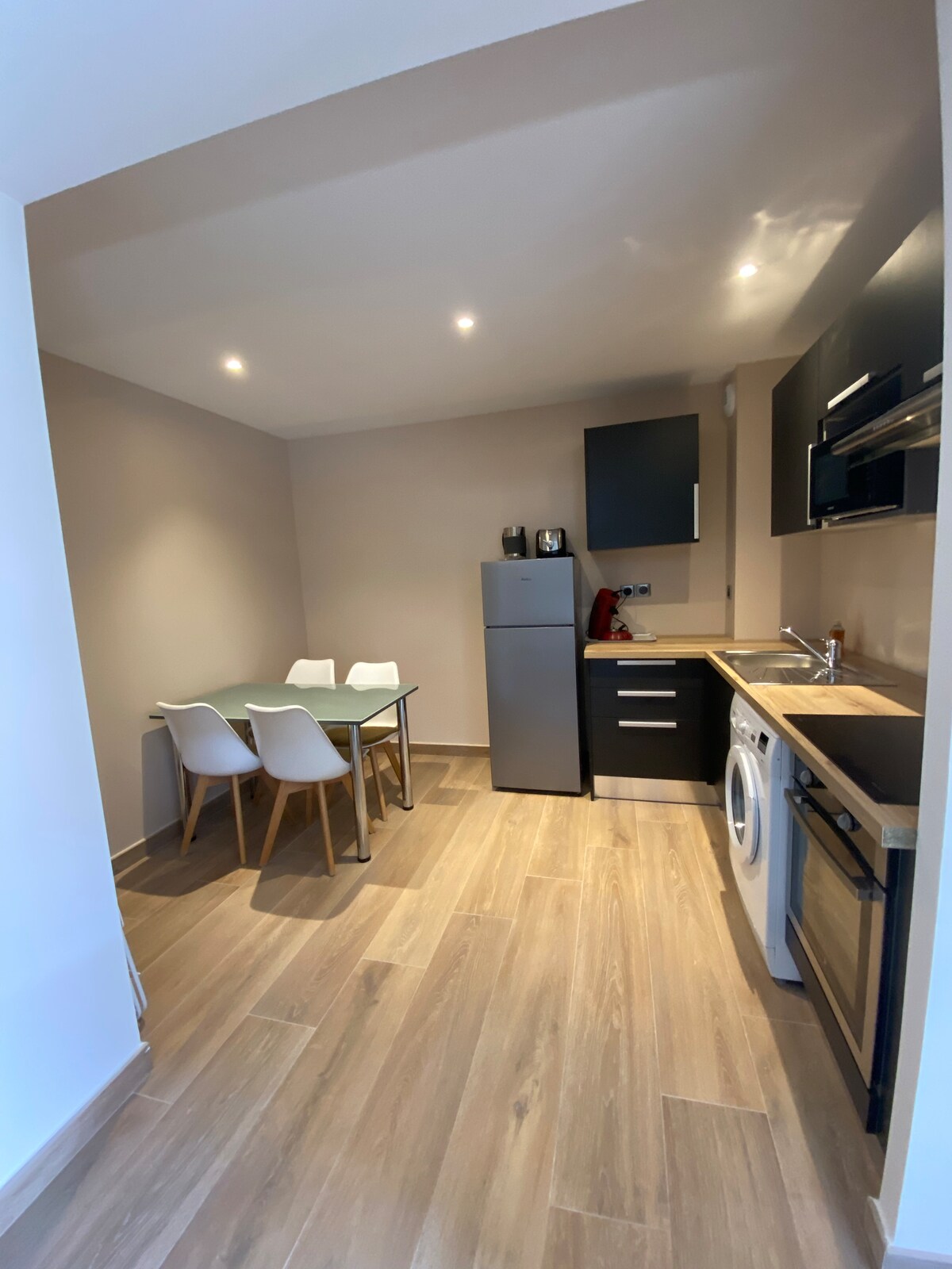 Welcome to this cute studio adjoining my house with its independent entrance and outdoor space. Perfect for a couple or a single person traveling without pets. Thank you. The 16 m2 living room includes: - Double bed with good mattress and two-seater sofa bed - a table, two chairs, stools - a large wardrobe Kitchen entrance: - Equipped kitchen area + fridge/freezer - Microwave oven - Dining area Bathroom with shower and washing machine. Linens and towels included