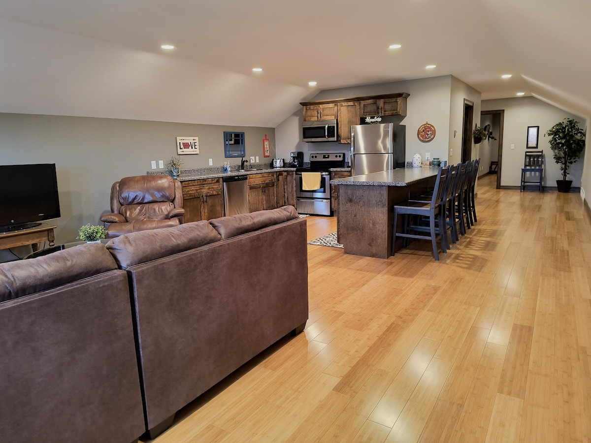 Situated just 2 minutes north of Decorah on Hwy 52, this completely separate 1,300 sq. ft space features a full kitchen, 2 large bedrooms, 1 bath, 3 queen beds & sleeps 6 people! This space has a large 6 person island to enjoy dinner &/or drinks with family & friends, or take it outside to the elevated deck & enjoy the scenery. We are just 2 minutes from the Trout Run Trail, the Upper Iowa River & Luther College, which is just down the hill. Our lovely downtown Decorah is only 5 minutes away.