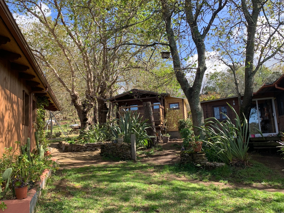 In the heart of the Salnes Valley, if you are looking for a quiet and natural place, our accommodation has three beautiful wooden cabins located in our flowery and wooded garden. It is a beautiful place surrounded by forest and vineyards with the river beach a 3-minute walk away. It is a very well-connected area with places that you will want to know and visit. See the description of the cabin below. (We do not accept pets and it is forbidden to use camping gas for cooking).
