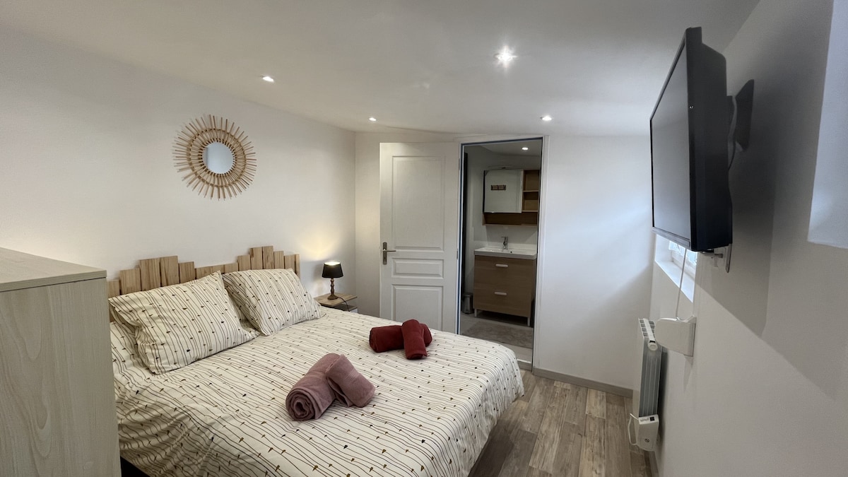 A small love nest in the heart of St-Valery-sur-Somme, the Somme’s bay welcomes couples for a moment of relaxation and peace thanks to its Spa area and a bedroom with a king-size bed. Warmly welcomed , bathrobes and cozy towels will accompany you in the spa area, equipped with a large jacuzzi with 2 massage areas, a Finnish sauna and two separate showers. And more a quality sound system and chromotherapy for the pleasure of the senses.