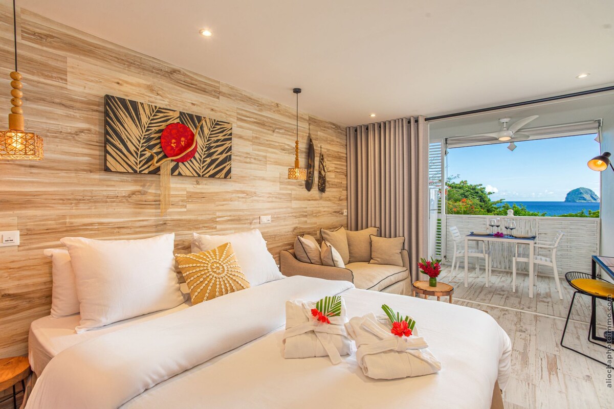 An exceptional place to enjoy Martinique! Magical views, direct access to the sea and the Black Diamond swimming pool ???? Our chic white studio boasts a beautiful terrace with outdoor kitchen, so you can live to the rhythm of the island, lulled by the lapping of the waves and the song of the birds. Magnificent beaches are all around, like Anse Noire, where you can swim with giant tortoises! And the many typical villages are an opportunity to discover Creole culture.