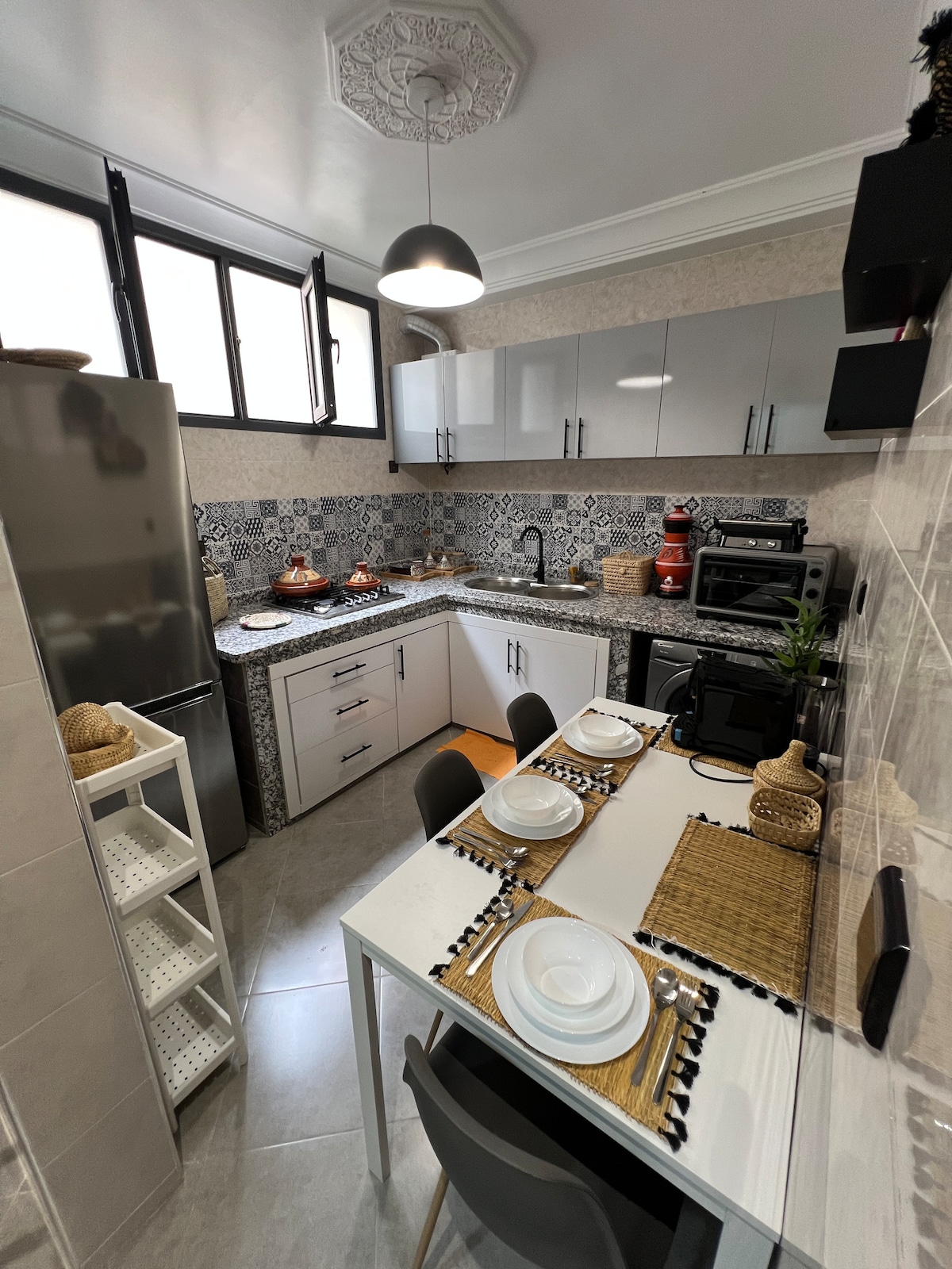 Un appartement au rez-de-chaussée ayant une superficie de 100 m .qui contient 2 chambre 2 salle de bain un salon une cuisine et un (URL HIDDEN) petit jardin devant la maison. Style Tadlakt et arcade qui donne à l appartement un charme traditionnel .qui se situe dans un endroit paisible proche de la mer.