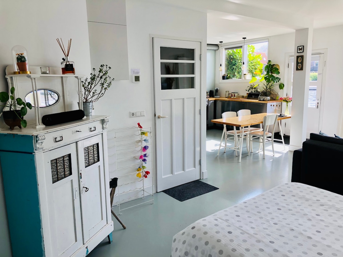 Spacious bright ground floor studio located on the river Rhine in Oud Leiderdorp. Close to Leiden and Amsterdam, the beaches of Noordwijk, Katwijk, and the flowers of the Keukenhof. In a fine weather, you can enjoy the morning sun directly on the water with a fresh cup of coffee. The studio is completely independent with private access, a very complete kitchen, a good bed, and a spacious bathroom. Free bicycles are included, the way to transport yourself in the Netherlands!