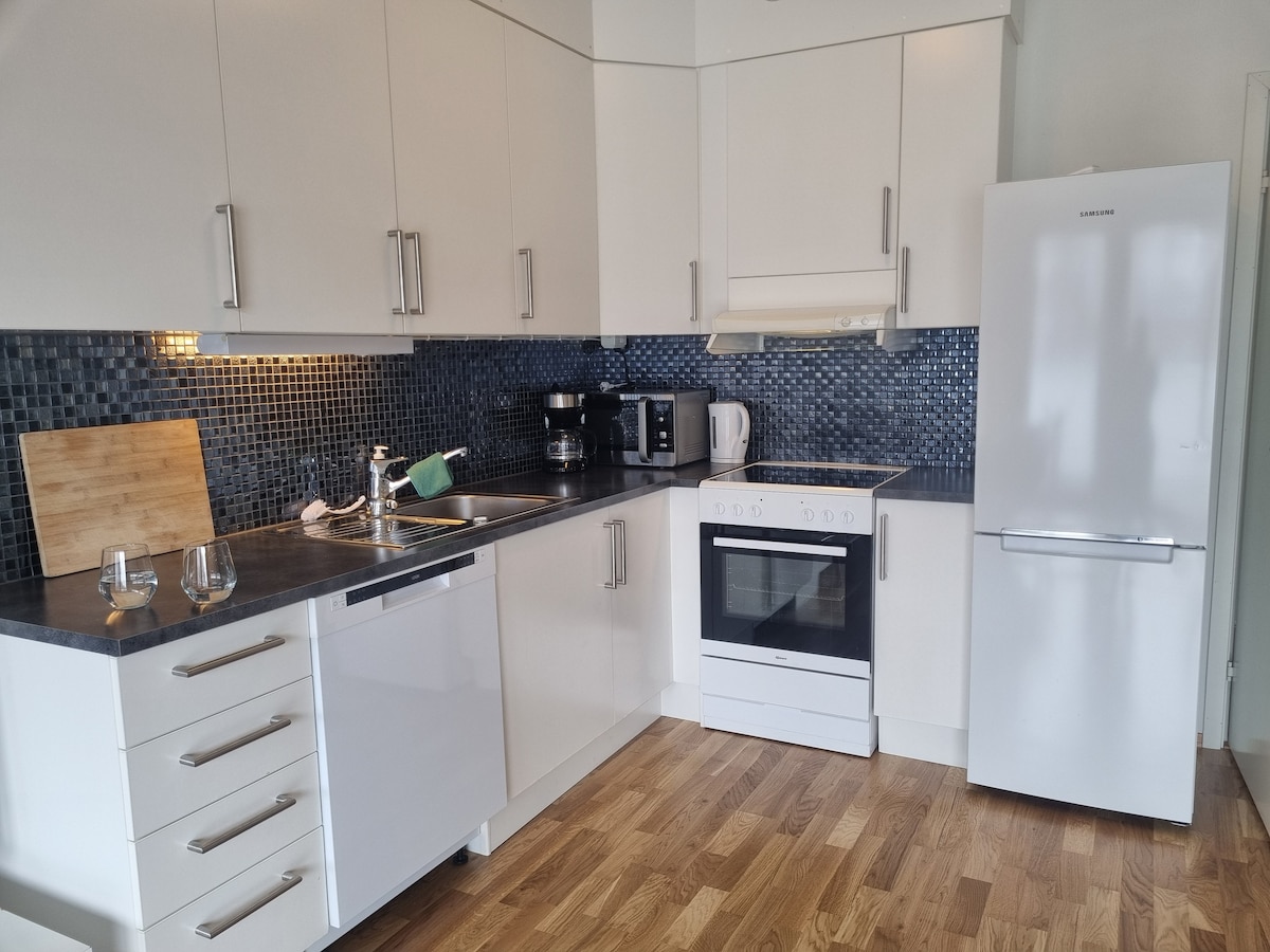 This great and central apartment is located on the 2nd floor and is 43 m2. The apartment contains hallway, bedroom, bathroom and living room with kitchen solution. There is also a private balcony. Vervet area is a newly developed district in Tromsø, with restaurants, cafes right by. The city center is only a 5 minutes’ walk from the apartments, same for the Artic Cathedral across the bridge. The apartment building is modern and placed right by the harbor.