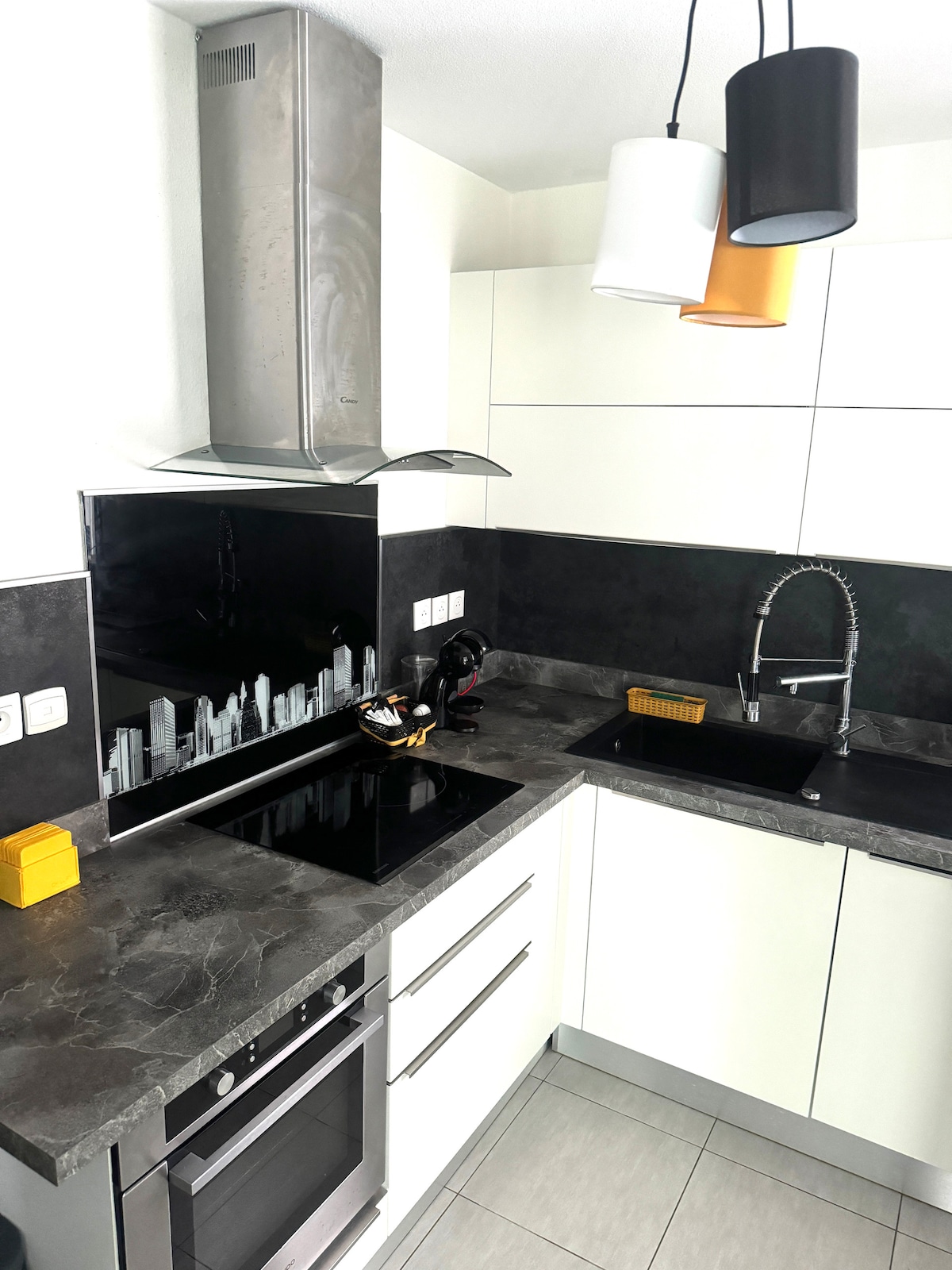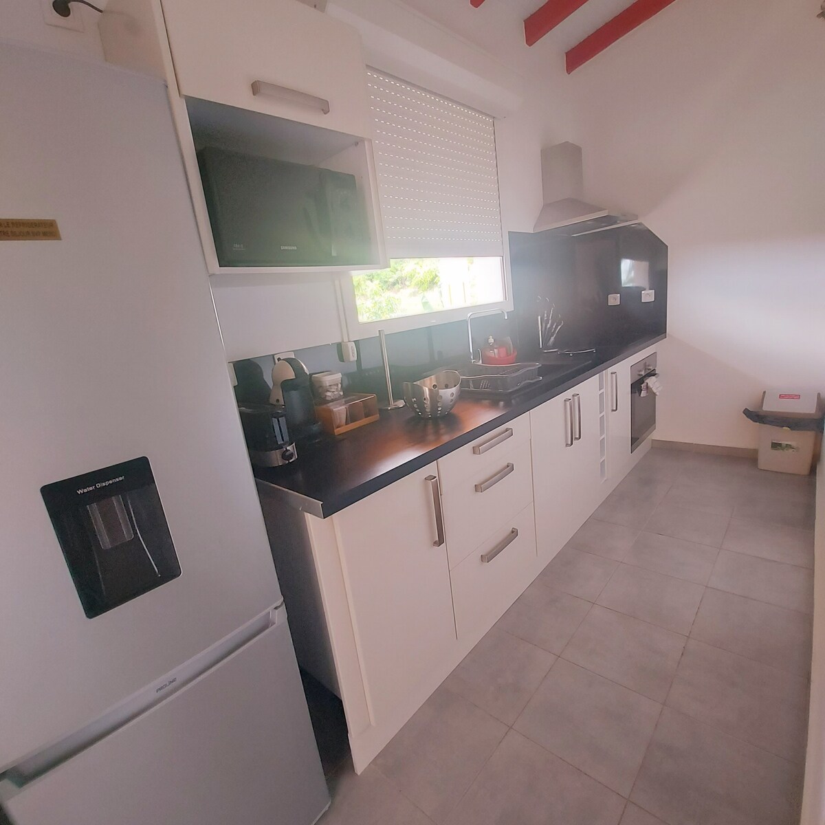 70 m2 apartment, quite spacious and modern, with a colorful design located on the ground floor, in the city of Abymes, so you won't have to climb stairs with your luggage. This accommodation is located in a quiet and secure residence. It is close to the city center and all amenities: Airport, Shopping Center, Supermarkets, Bakeries, Gas Stations, Cinema, Beaches … The residence is wooded and green, with a private parking space and a common pool.