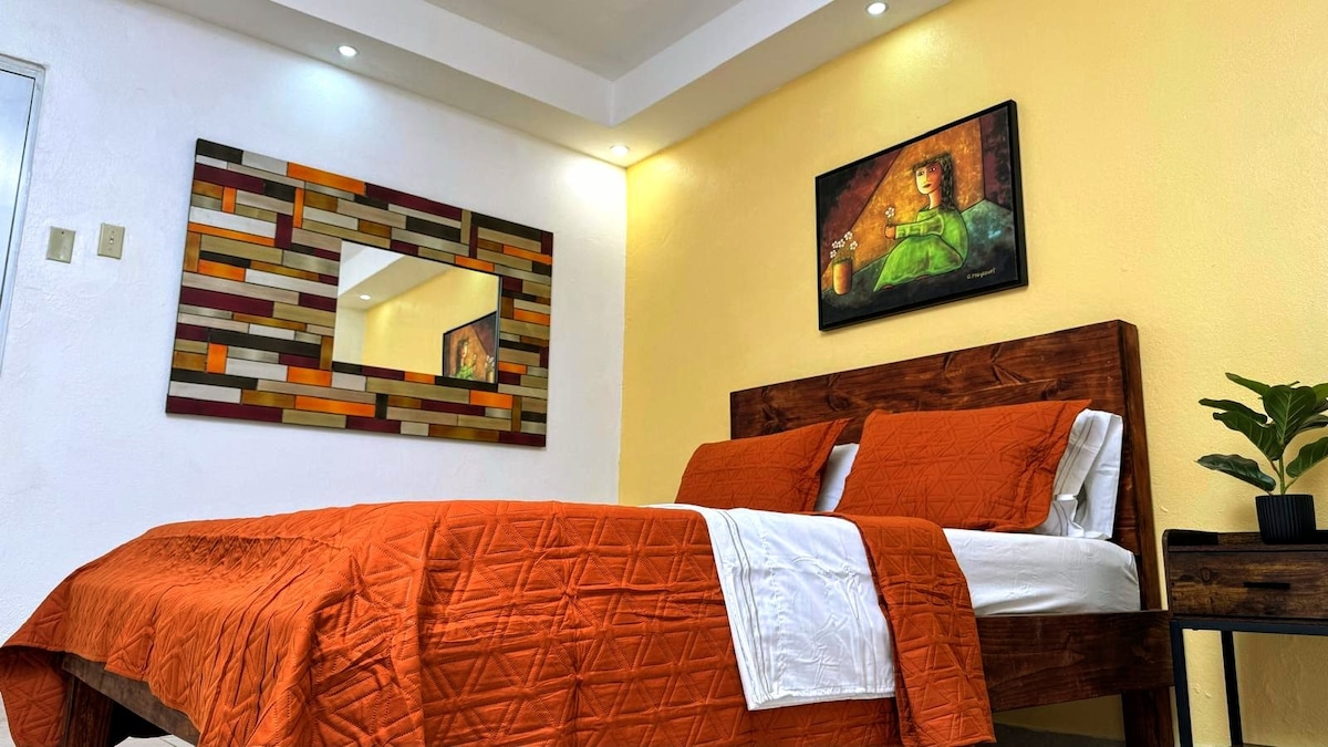 Hermoso Airbnb diseñado para pareja y/o cuatro huespedes. Con enfoque minimalista y romántico. Sorprenda a su pareja con el hermoso cuarto con jacuzzi que hará que sus días sean inolvidables. Amplia y cómoda cocina equipada, hermosa sala con TV Smart, WiFi, hermoso cuarto de dormitorio con su cama tamaño Queen y closet de espejos. Comodo Mattress auto inflable para huéspedes adicionales a la pareja. Ubicado en el segundo piso. Acogedora terraza donde podrán sentarse y contemplar el cielo juntos.